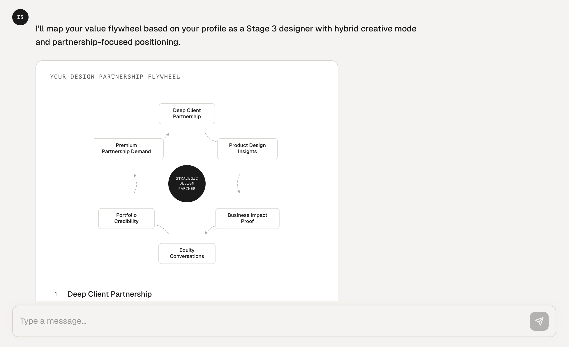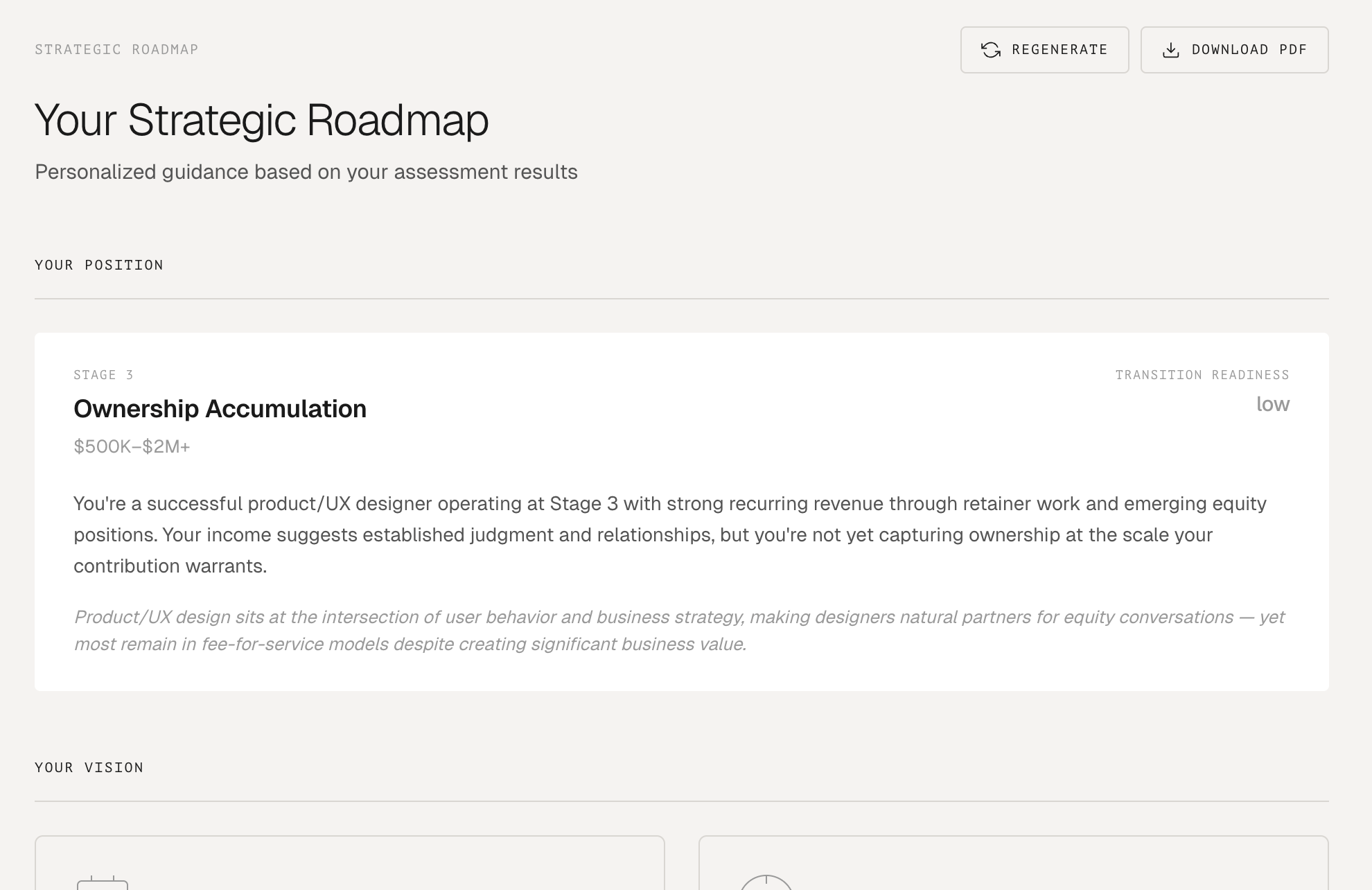 Structured assessment across the four-stage progression from execution to ownership. Identifies your current stage, creative mode, and the specific structures most relevant to where you are and where you're heading.