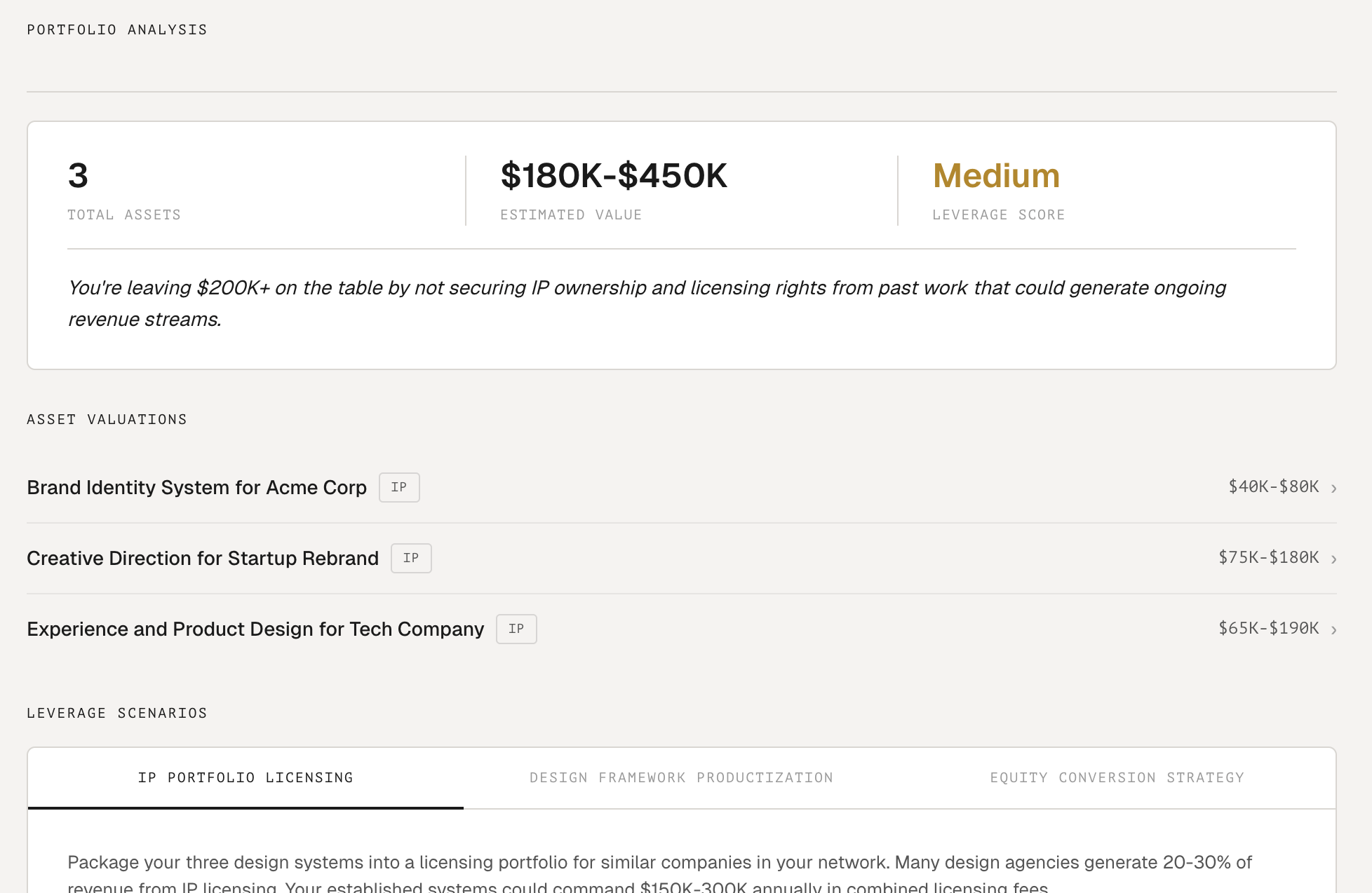 Catalog your IP, revenue streams, and ownership positions in one view. Understand what you own, what it's worth, and how your portfolio of assets is compounding — or where the gaps are.