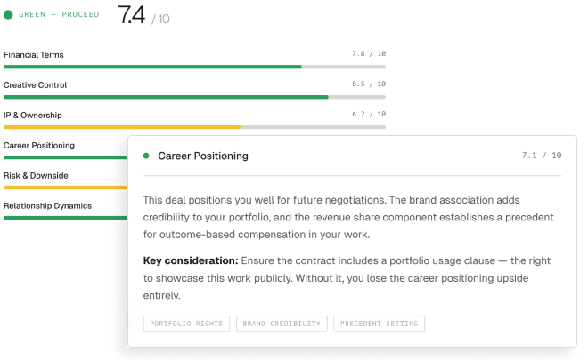 Multi-dimensional assessment across financial terms, risk exposure, leverage position, and alignment with your career stage. Get a structured verdict with specific recommendations before you sign.